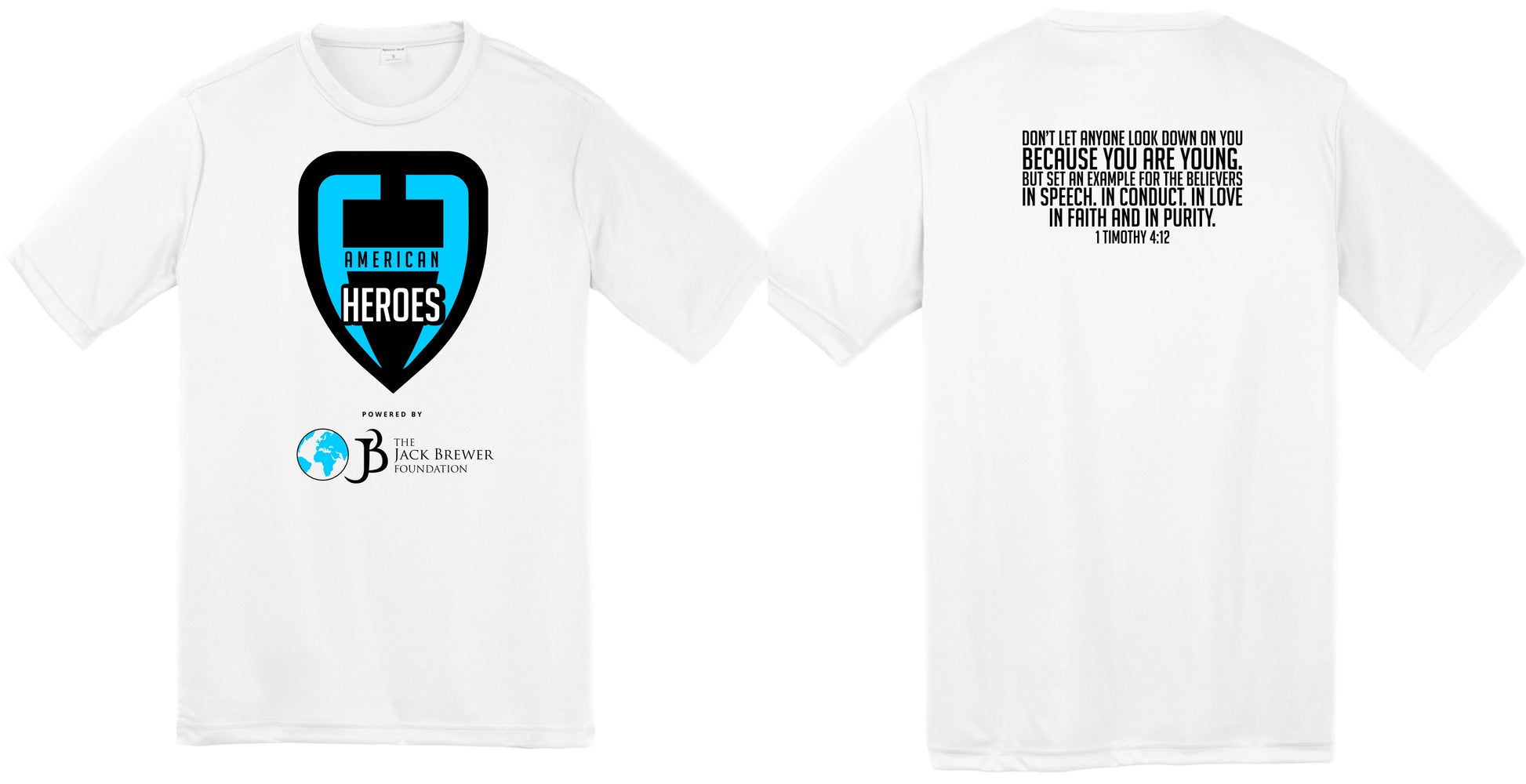 Bold in message and mission, the Jack Brewer Foundation American Heroes T-Shirt is more than just a tee—it's a statement of courage, faith, and leadership. Featuring the striking American Heroes shield on the front and an inspiring verse from 1 Timothy 4:12 on the back, this shirt is made to empower and uplift every generation.